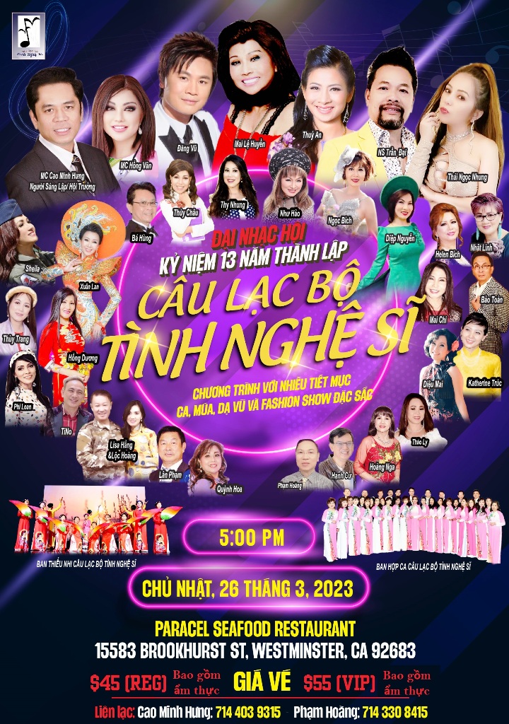 Xin xem thêm chi tiết trong Flyer đính kèm. Mong quý vị liên lạc với anh Cao Minh Hưng ở số 714-403-9315 hoặc anh Phạm Hoàng ở số 714-330-8415 để lấy vé.