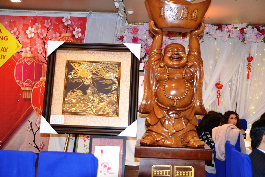 Cũng vậy, tác phẩm bằng gỗ tạc tượng Phật Di Lặc luôn mỉm cười ban phước cho chúng sanh, được Thầy giải thích theo kinh Phật và Thầy cam kết, ai có bức tượng này mang về để trong nhà sẽ sớm gặp may mắn và nếu muốn, Thầy sẽ tới tận nhà để chỉ chỗ xứng đáng và đặt bức tượng. Với lời cam kết trên cùng tài hoạt náo của nghệ sĩ Hồng Đào, bức tượng từ $1,000 nhanh chóng tăng lên $4,000, $4,500 và cuối cùng một Phật tử tên Nghĩa giơ tay nói $5,000. Không còn ai tranh hơn với anh Nghĩa nên từ giờ phút này anh Nghĩa là chủ nhân bức tượng và sau đó, hai thiện nguyện viên đã mang bức tượng ra xe cho anh Nghĩa, và anh muốn Thầy về nhà anh chỉ chỗ và đặt tượng như Thầy đã chỉ dẫn.