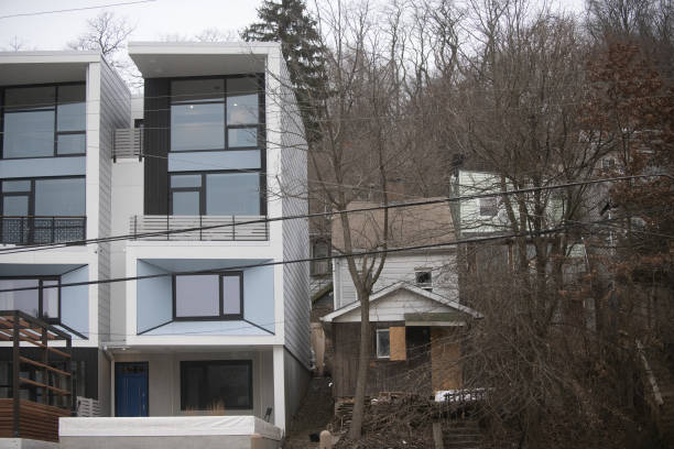 Nhà chung cư mới xây bên cạnh nhà bỏ hoang tại khu ngoại ô Lawrenceville thuộc thành phố Pittsburgh, Pennsylvania trong hình chụp tháng Giêng, 2020. Nhờ các công ty kỹ thuật được mở, Pittsburgh thu hút người trẻ đến đây, đồng thời nâng giá nhà nhưng vẫn rẻ so với California. (Getty Images)
